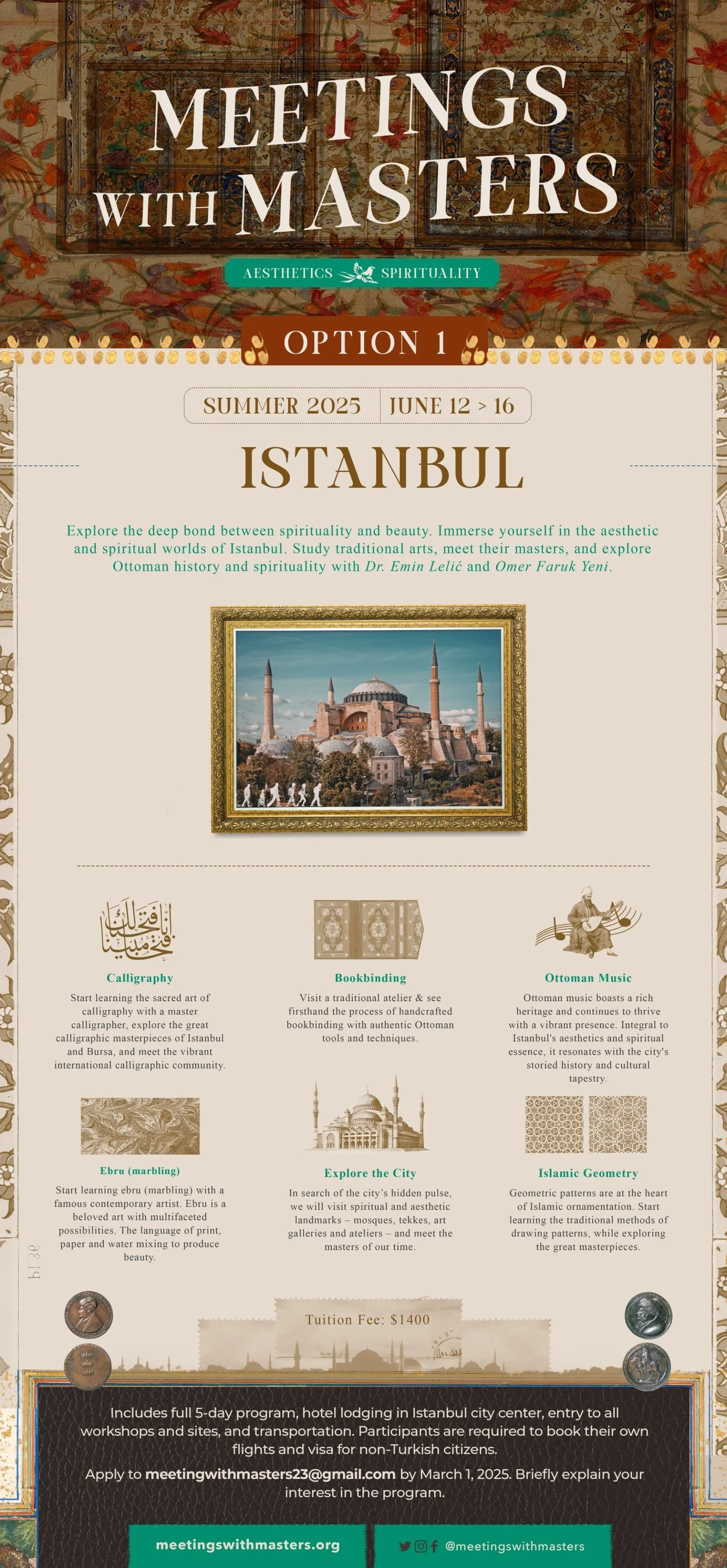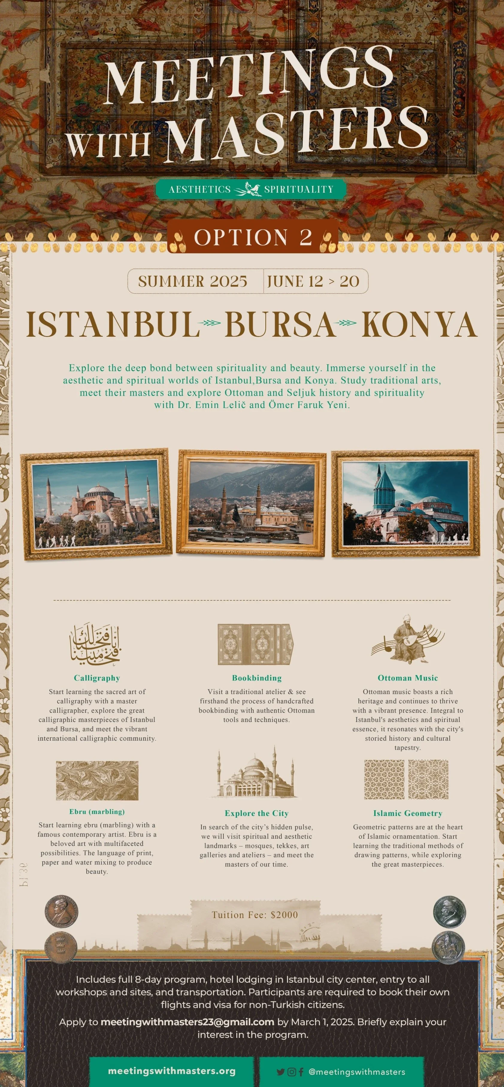 By way of immersion into Istanbul’s traditional aesthetic world, this is a great opportunity to study calligraphy (khatt), marbling (ebru) and Islamic Geometry with living masters, and observe carefully the arts of illumination (tazhib), bookbinding (jild-i kitab), architecture and Ottoman sacred music – surroundings which by their beauty recall our heavenly origin and thereby also awaken our hope.
